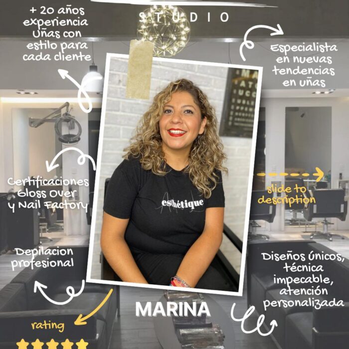 Además de ser una experta en manicure, Marina ofrece pedicuras cuidadosas y cómodas, así como servicios de depilación, todo con un enfoque en la calidad y el bienestar de sus clientes. Su compromiso con resaltar la belleza natural, combinado con su creatividad y habilidad técnica, la convierten en la elección ideal para quienes buscan un cuidado integral.