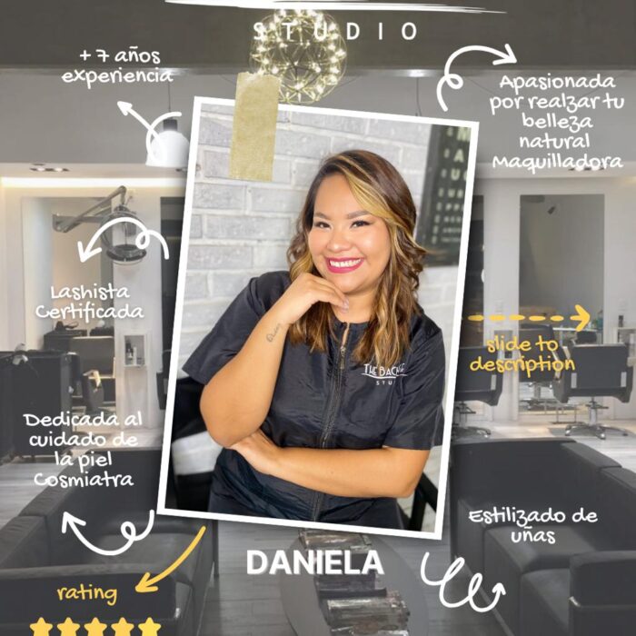 Con más de 7 años de experiencia, Daniela es una apasionada de realzar la belleza natural a través de un enfoque consciente, detallado y personalizado. Como orgullosa morelense y profesional en belleza integral, se especializa en faciales, extensiones de pestañas, depilación facial y corporal, maquillaje social, manicuras y pedicuras, convirtiéndose en una experta versátil que cuida cada aspecto de tu imagen.
